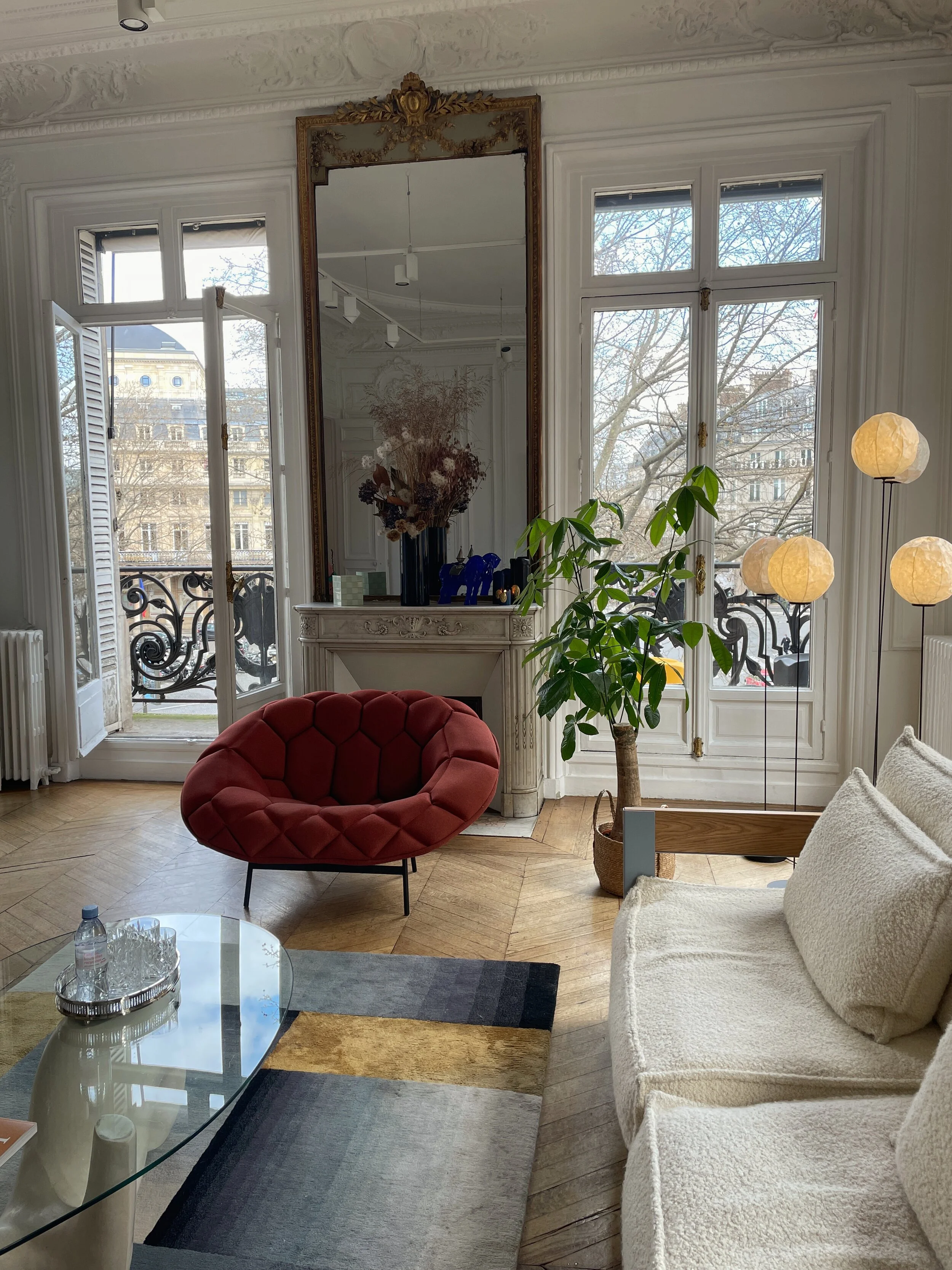 Alors, arpenter les pièces de cet appartement, c’est apprécier une sélection d’oeuvres et de pièces de Design ô combien plaisante. Dans les salons, des assises Philippe Malouin et Konstantin Grcic, une commode Stack réalisée par Raw Edges et Shay Alkalay et des oeuvres de Ronan & Erwan Bouroullec, rythment la pièce avec élégance et se partagent notre attention. Dans l’entrée, un banc en marbre rose par Pierre Gonalons et des céramiques de Liselotte Watkins ponctuent l’espace à la perfection. Dans le salon d’apparat, un prototype de table basse d’Hilton McConnico trône, superbe, sur un tapis tissé main “Up&Over” de Deirdre Dyson. Au coeur du boudoir, des tapisseries et rideaux Pierre Frey s’associent à une œuvre murale du jeune collectif KRJST studio. Tandis que les murs de l’appartement, nous permettent d’admirer la série photographique « Des Études Sauvages », issue de l’oeuvre puissante et poétique de l’artiste bulgare Elina Kechicheva.